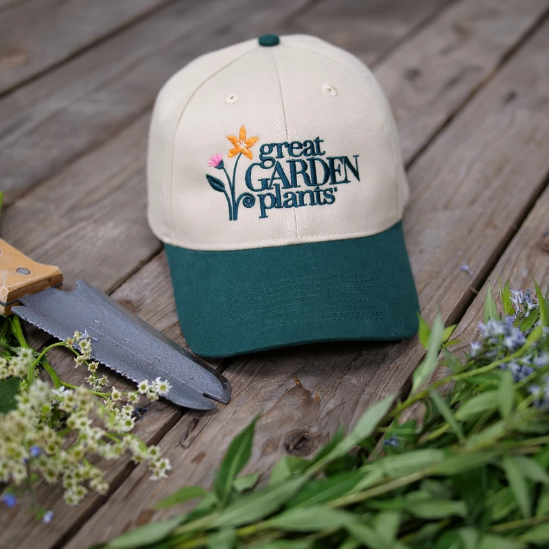 - Front of hat features an embroidered forest green Great Garden Plants logo.