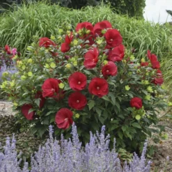 - Rich red saucer-shaped blooms pair with deep green maple-like leaves.